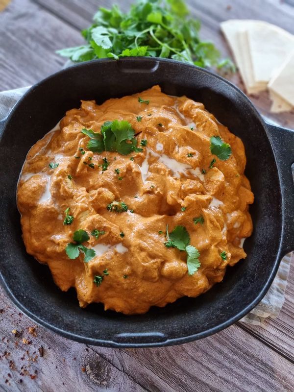 Die Hähnchenbrust in gleichgroße Würfel schneiden und in eine Schüssel geben. 2-3 gepresste Knoblauchzehen und 2 TL geriebenen Ingwer dazugeben. Mit 2 TL Sweet Curry, Let it Burn und dem Joghurt gut vermischen und für mindestens 3 Stunden ziehen lassen. Die roten Zwiebeln und Frühlingszwiebeln in Ringe schneiden, den Koriander hacken und die Mango würfeln. In einer Pfanne 2 EL Omas Butteröl erhitzen und die Hähnchenbrust braun anbraten. Das Fleisch herausnehmen und 4 EL Omas Butteröl erhitzen. Zwiebeln und Frühlingszwiebeln darin anschwitzen und mit den geschälten Tomaten ablöschen. Mit 1 TL Sweet Curry, Meersalz und Regenbogen Pfeffer würzen, Cashew-Kerne dazugeben und 15 Minuten köcheln lassen. Diese Masse in einem Mixer oder mit einem Pürierstab fein pürieren und die Kokosmilch oder Sahne unterrühren. Die Sauce zurück in die Pfanne geben, die Hähnchenbrust, den Koriander und die Mango unterheben und alles nochmals erhitzen. Mit Joghurt, Naan-Brot und/oder Basmatireis servieren.