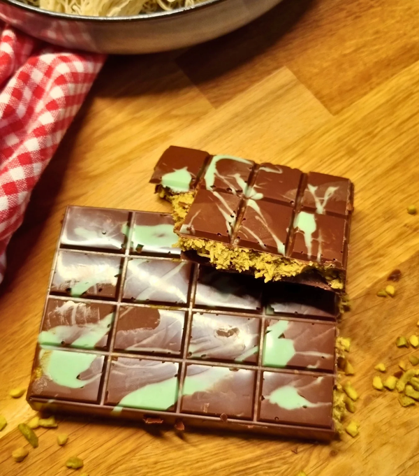 Die weiße Schokolade im Wasserbad schmelzen und wenn du magst mit Lebensmittelfarbe einfärben. Die grüne Schokolade in eine tiefe Schokoladenform sprenkeln und für ein paar Minuten in den Froster stellen. Die Teigfäden in kleine Stücke schneiden und in einer Pfanne mit Omas Butteröl bei schwacher Hitze goldbraun rösten, bis sie knusprig sind. Pistazienmus, Tahin, Pistaziencreme und Wonkas Tonka dazugeben und gut miteinander vermengen. Zum Abkühlen beiseite stellen. 2/3 der dunklen Schokolade im Wasserbad schmelzen. Die Schüssel vom Topf nehmen und das letzte Drittel unterrühren bis alles geschmolzen ist. Eine dünne Schicht auf die grüne Schokolade geben und auch die Ränder der Form bestreichen. 5 Minuten in den Froster stellen. Nach der Kühlzeit die Füllung darauf verteilen, mit der restlichen Schokolade bedecken und eine Stunde kaltstellen bis die Schokolade durchgekühlt ist. Danach aus der Form lösen und genießen!