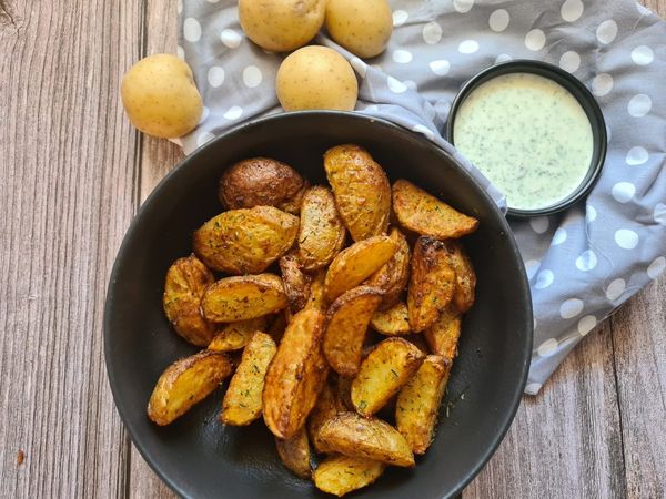 Die Kartoffeln waschen und ungeschält vierteln oder sechsteln. Smoky Rub mit Fritten Frieda und dem Griech. Olivenöl zu einer dickflüssigen Marinade anrühren und die Kartoffeln rundherum damit benetzen. Auf ein Backblech geben und für 30-40 Minuten bei 220 Grad im Ofen backen.